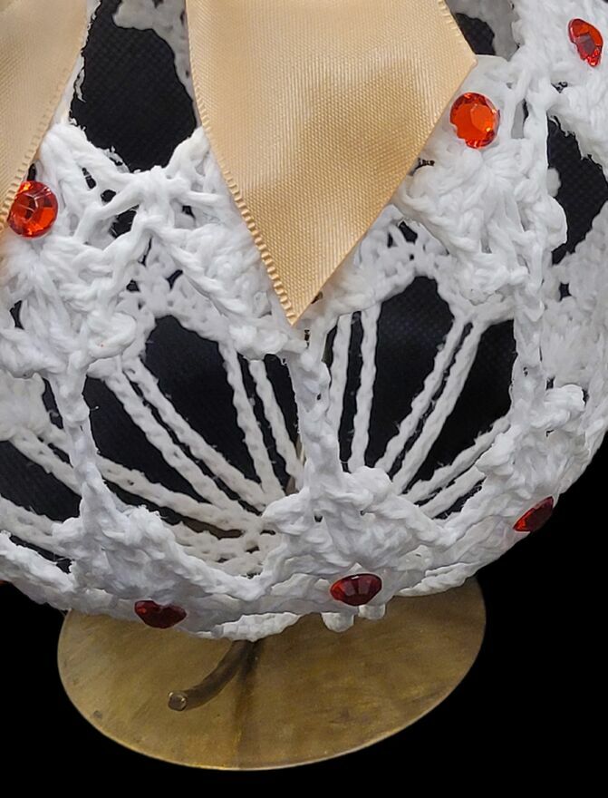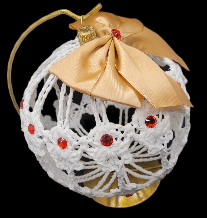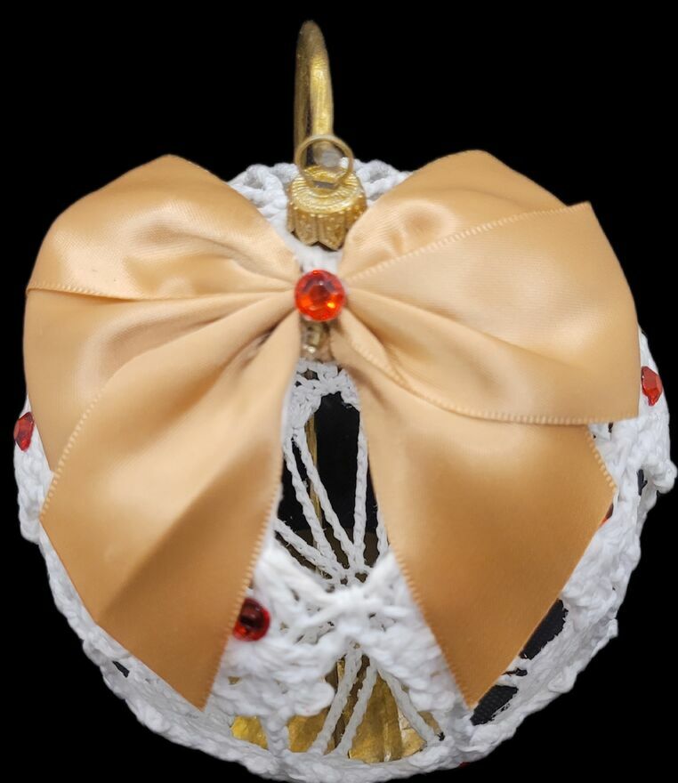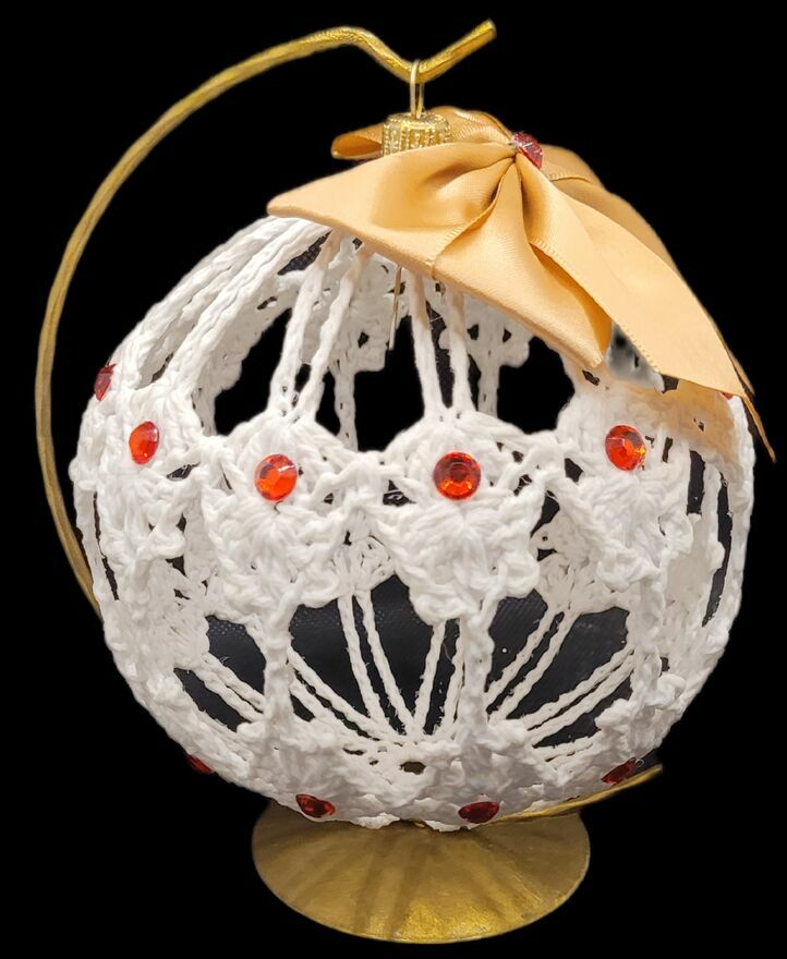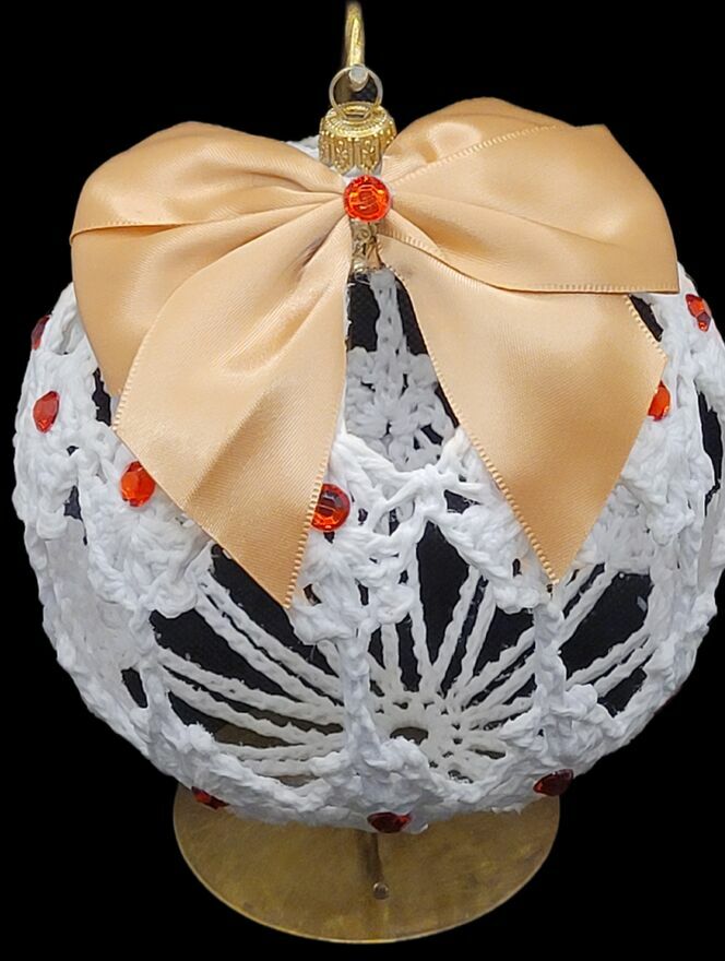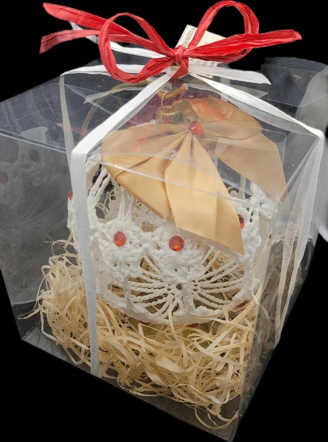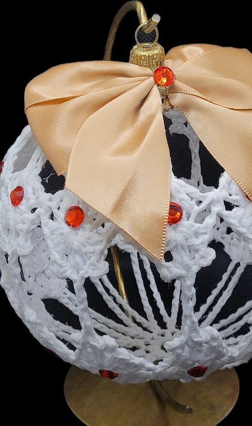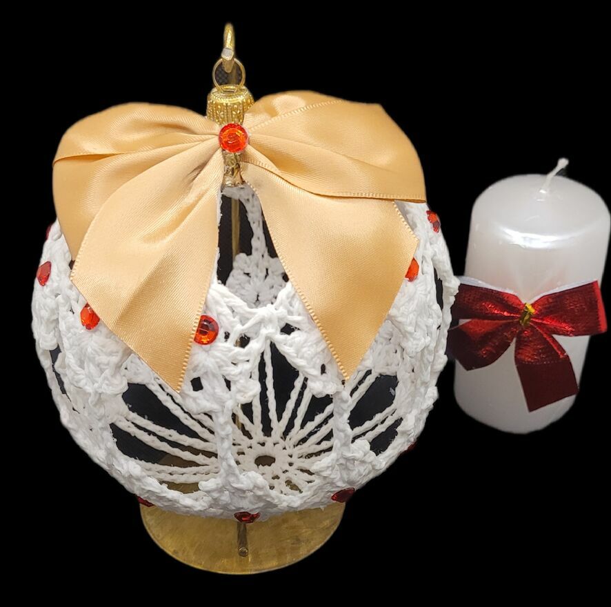 Ręcznie robiona bombka na stojaku – elegancka dekoracja świątecznaSprzedam wyjątkową bombkę wykonaną na szydełku, ozdobioną koralikami oraz dużą, dekoracyjną kokardą. Bombka umieszczona jest na eleganckim stojaku, dzięki czemu pięknie prezentuje się na półce, stole, komodzie czy przy świątecznym stroiku.