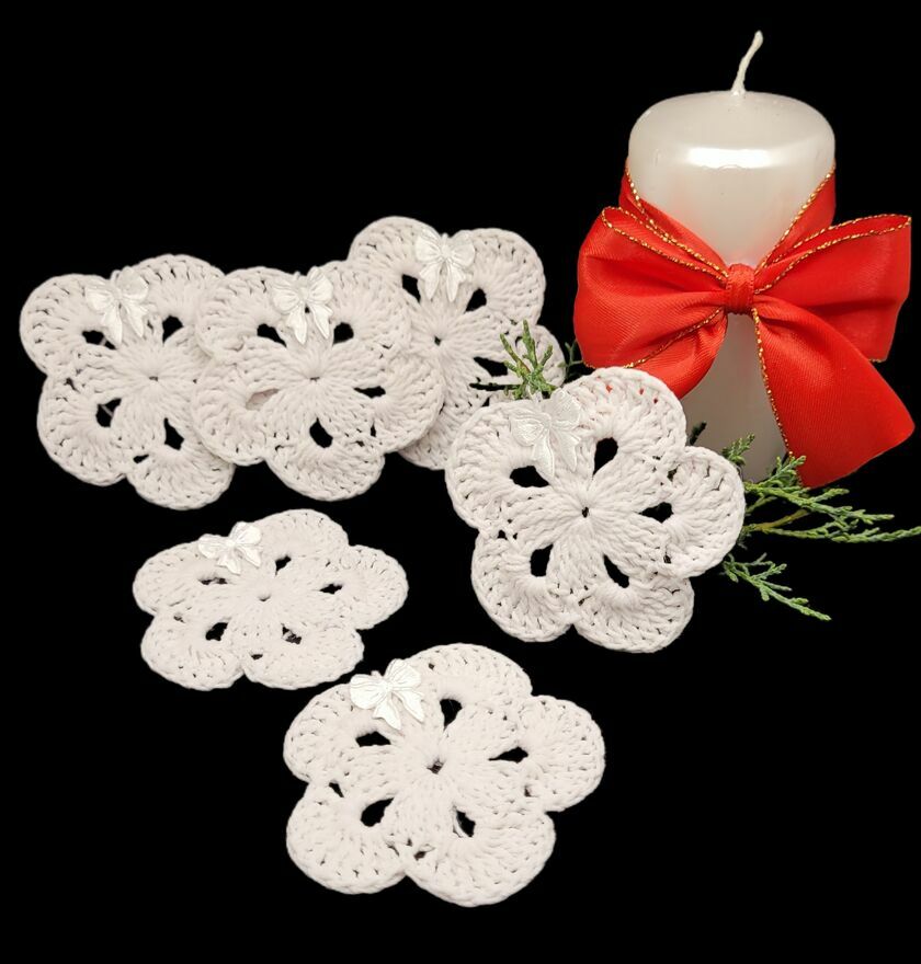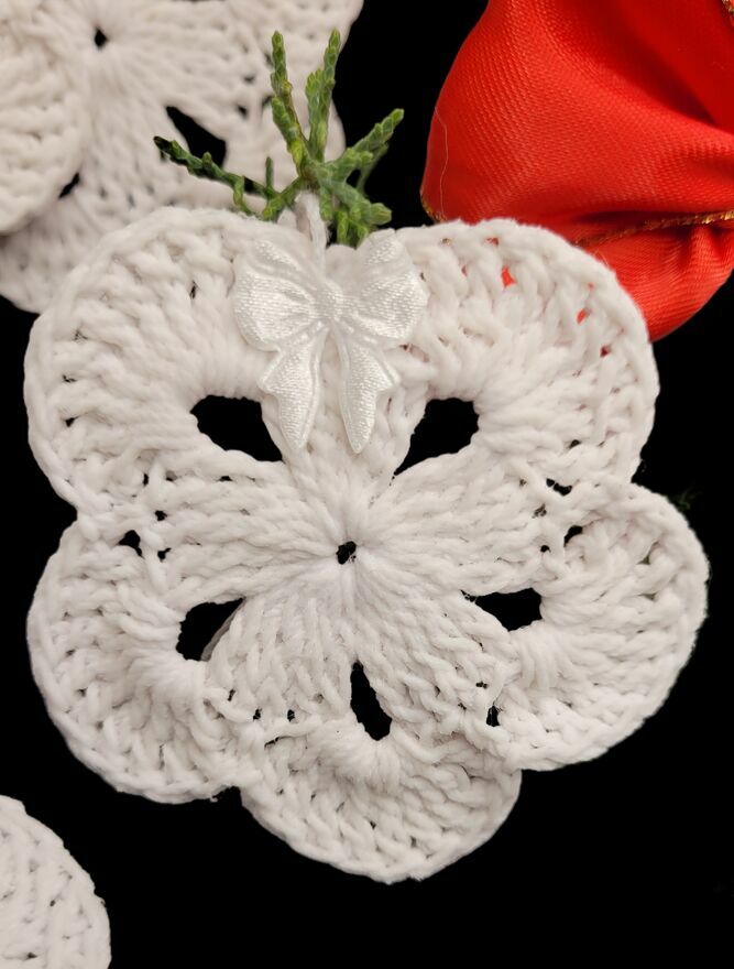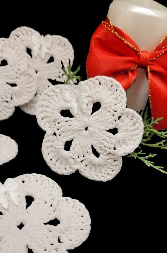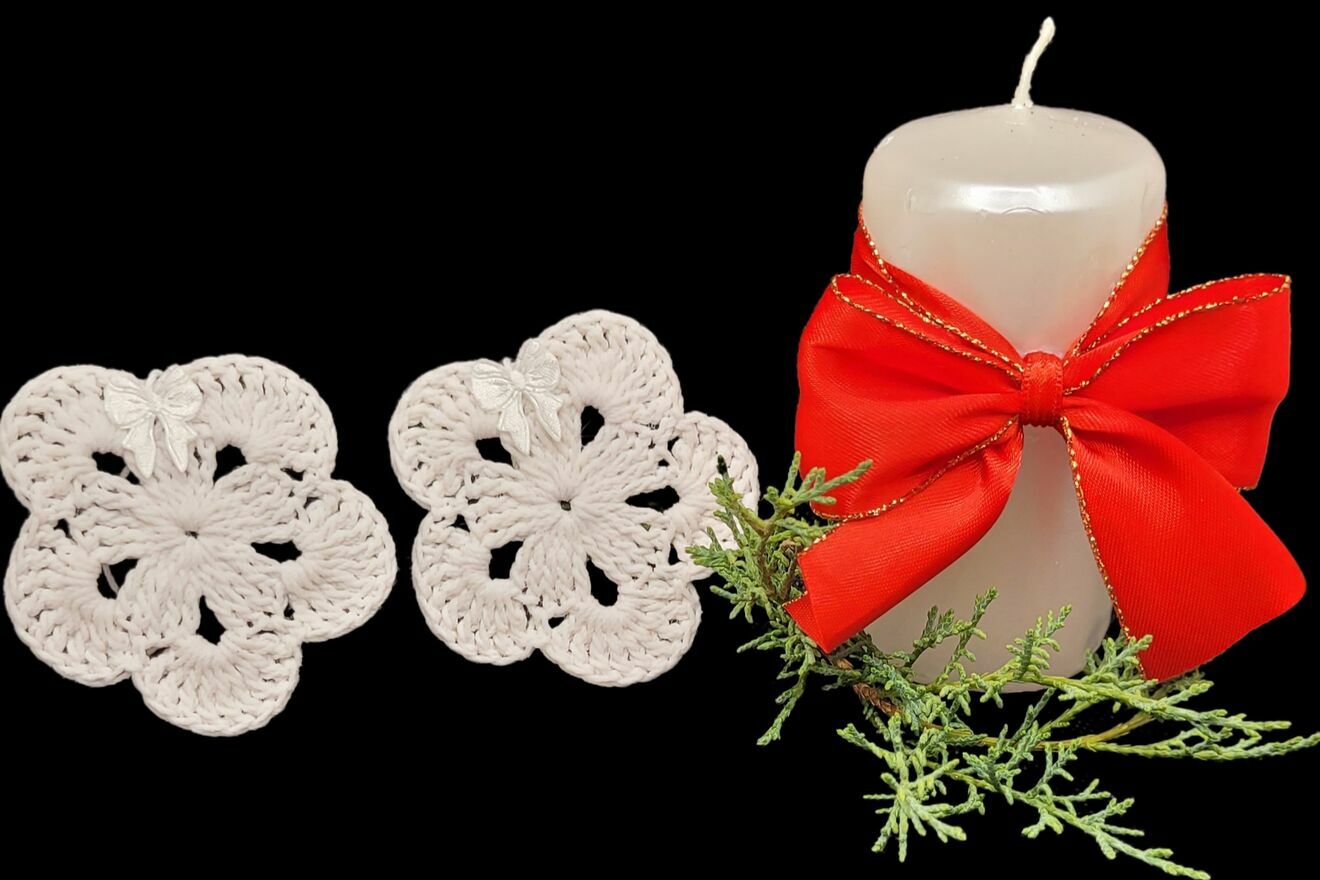 Zawieszki choinkowe kwiatuszki ręcznie wykonane na szydełku. Mocno usztywnione. Komplet zawieszek płaskich.Kwiatuszek 7cm ×6szt