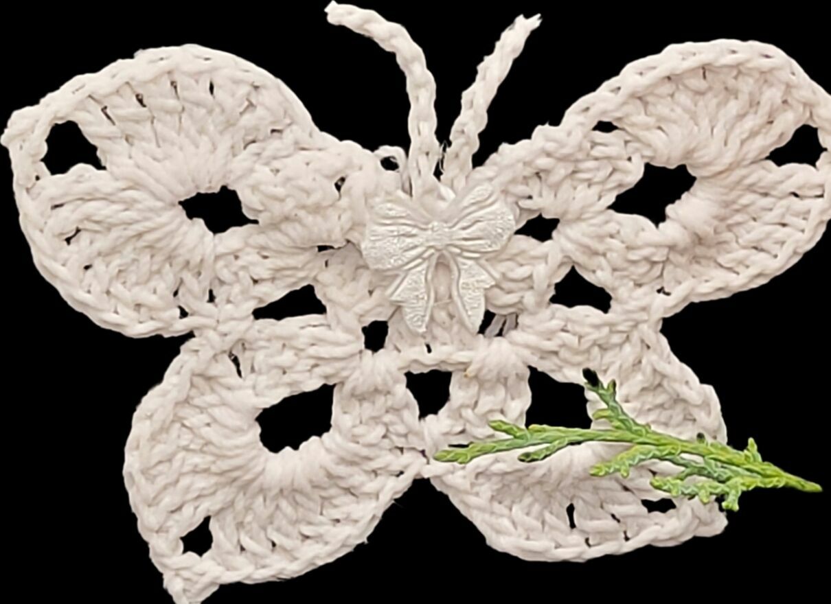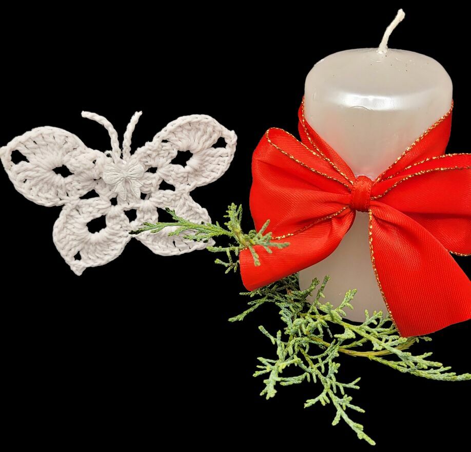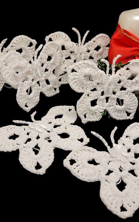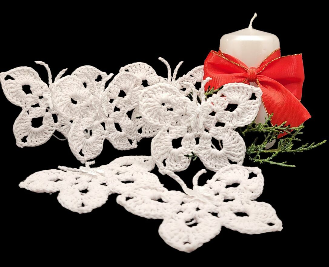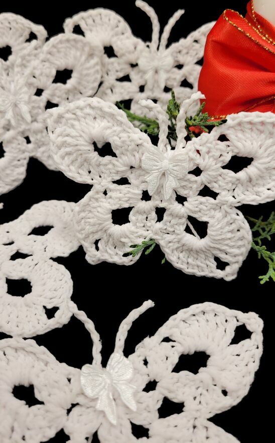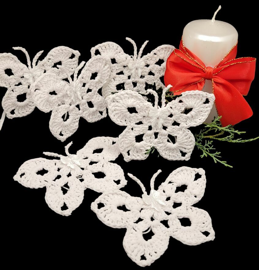 Zawieszki choinkowe motylki ręcznie wykonane na szydełku. Mocno usztywnione. Komplet zawieszek płaskich.Motylki 6/9cm ×6szt