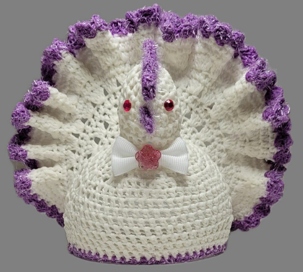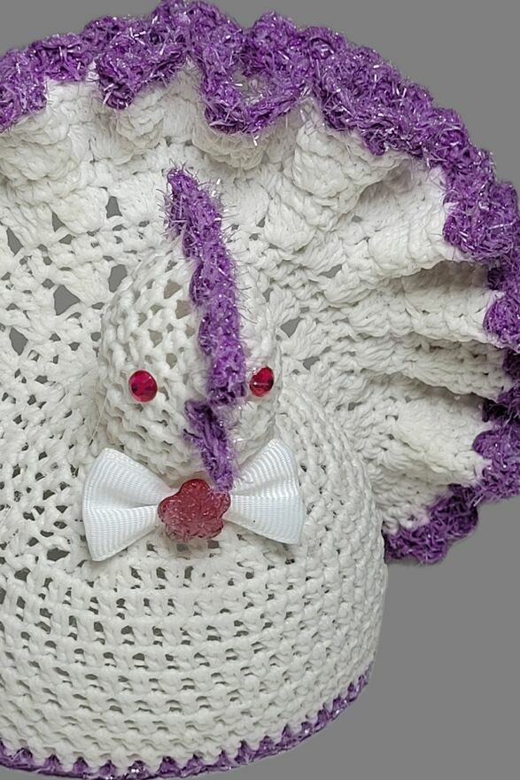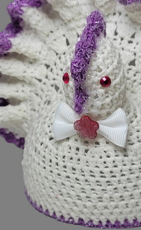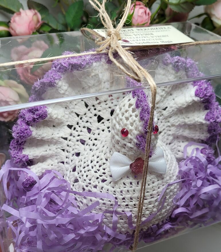 Wykonana z bielonego kordonka z fioletowym wykończeniem i ozdobną kokardką.