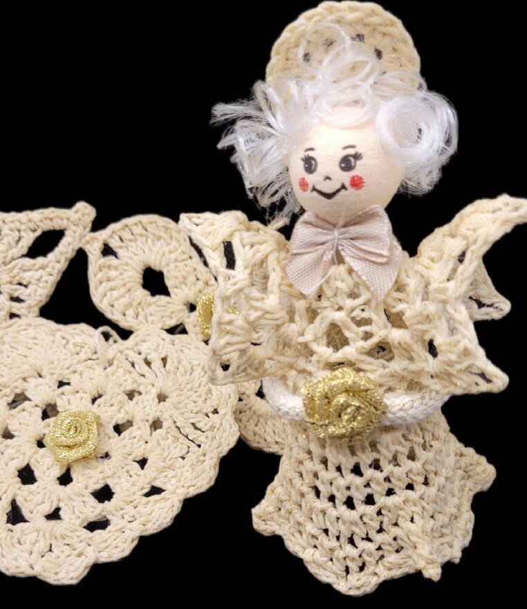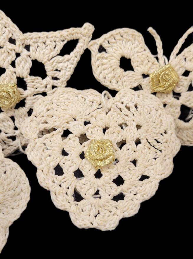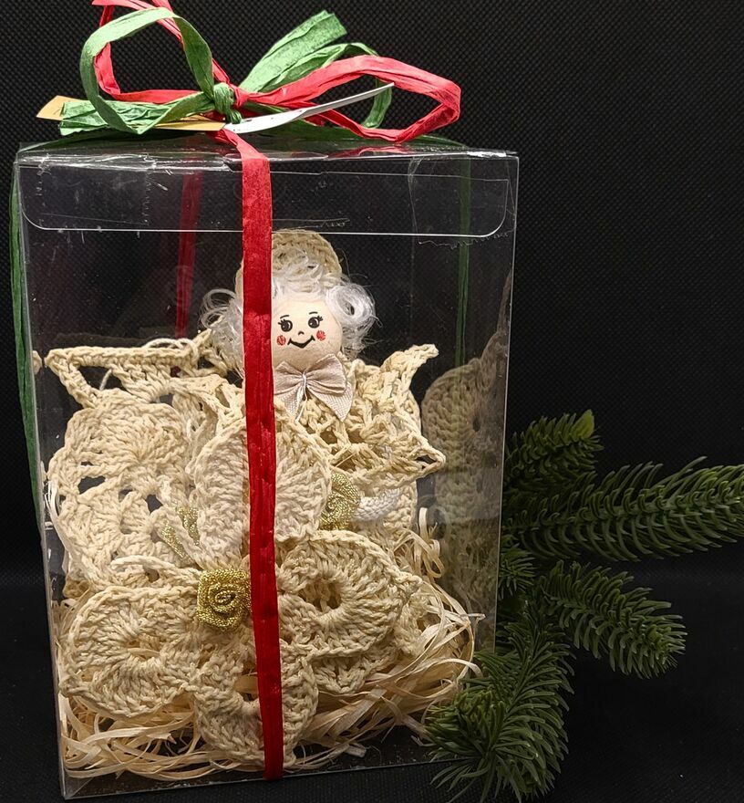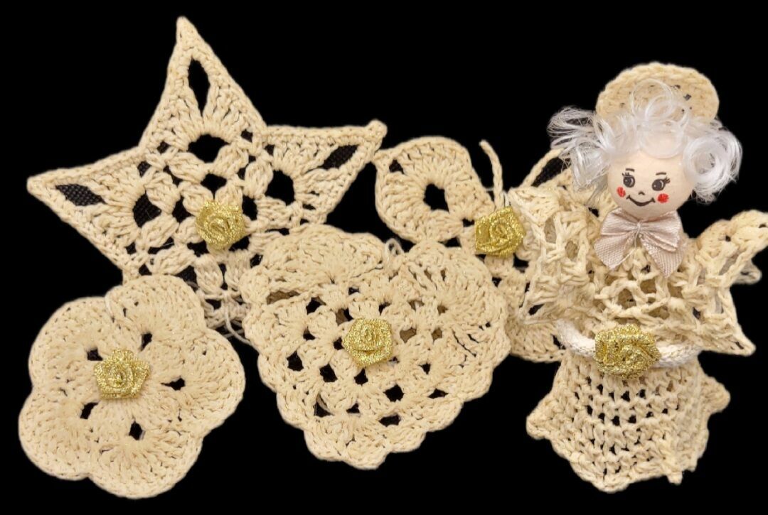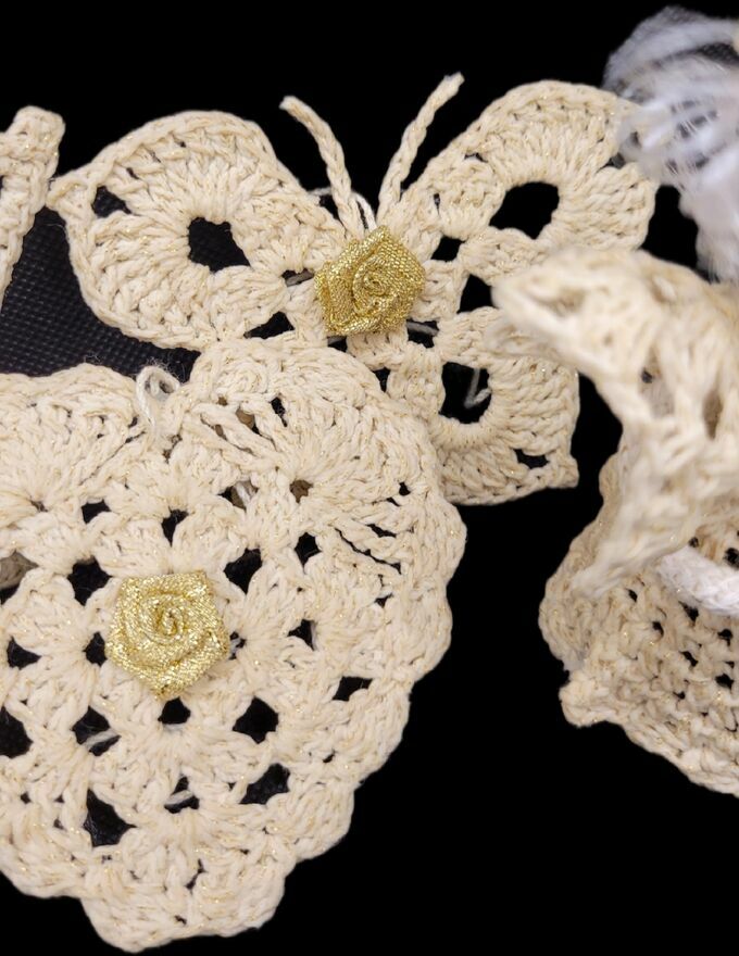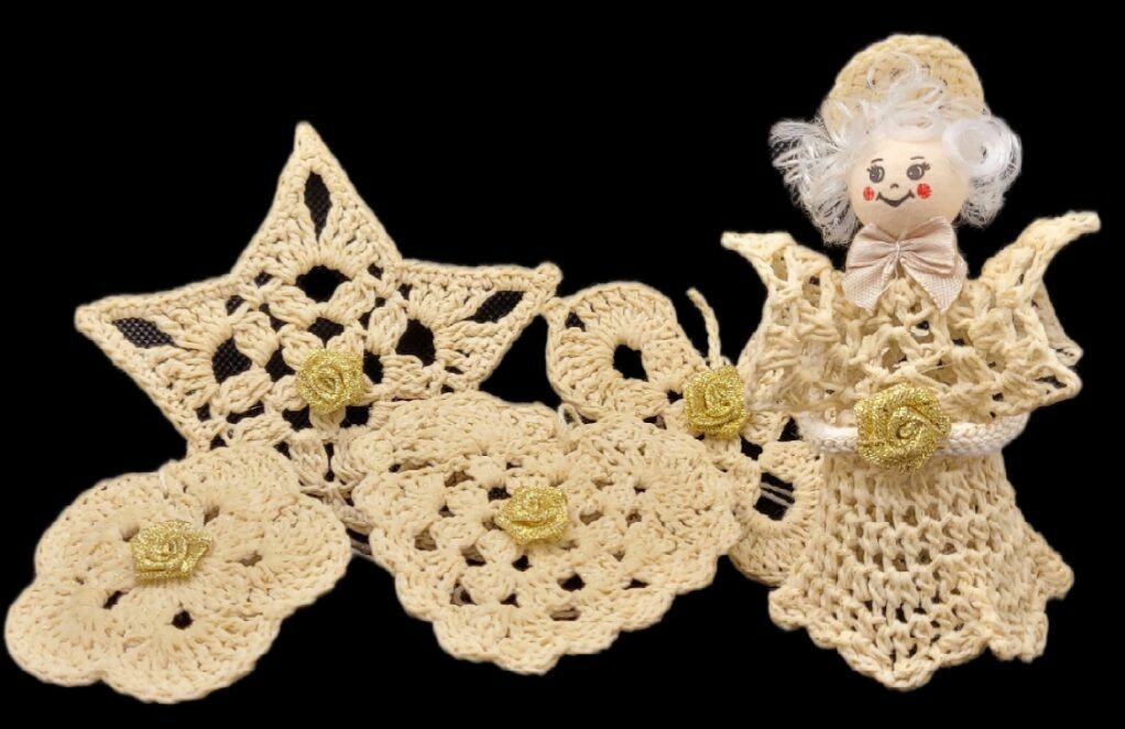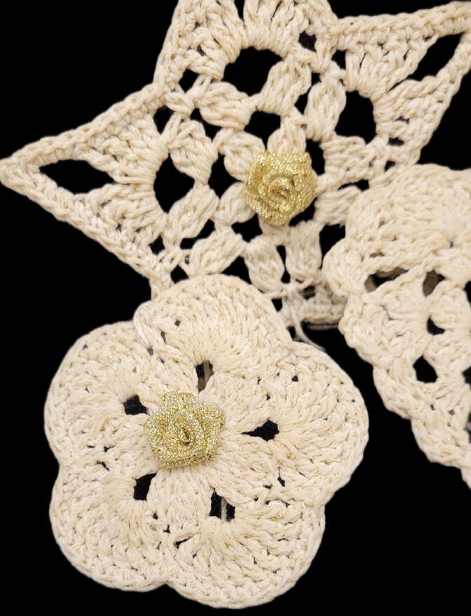 Każdy element został wykonany z dbałością o detale, z wysokiej jakości nici w eleganckim, naturalnym kolorze. Złote różyczki dodają całości wyjątkowego, świątecznego blasku.